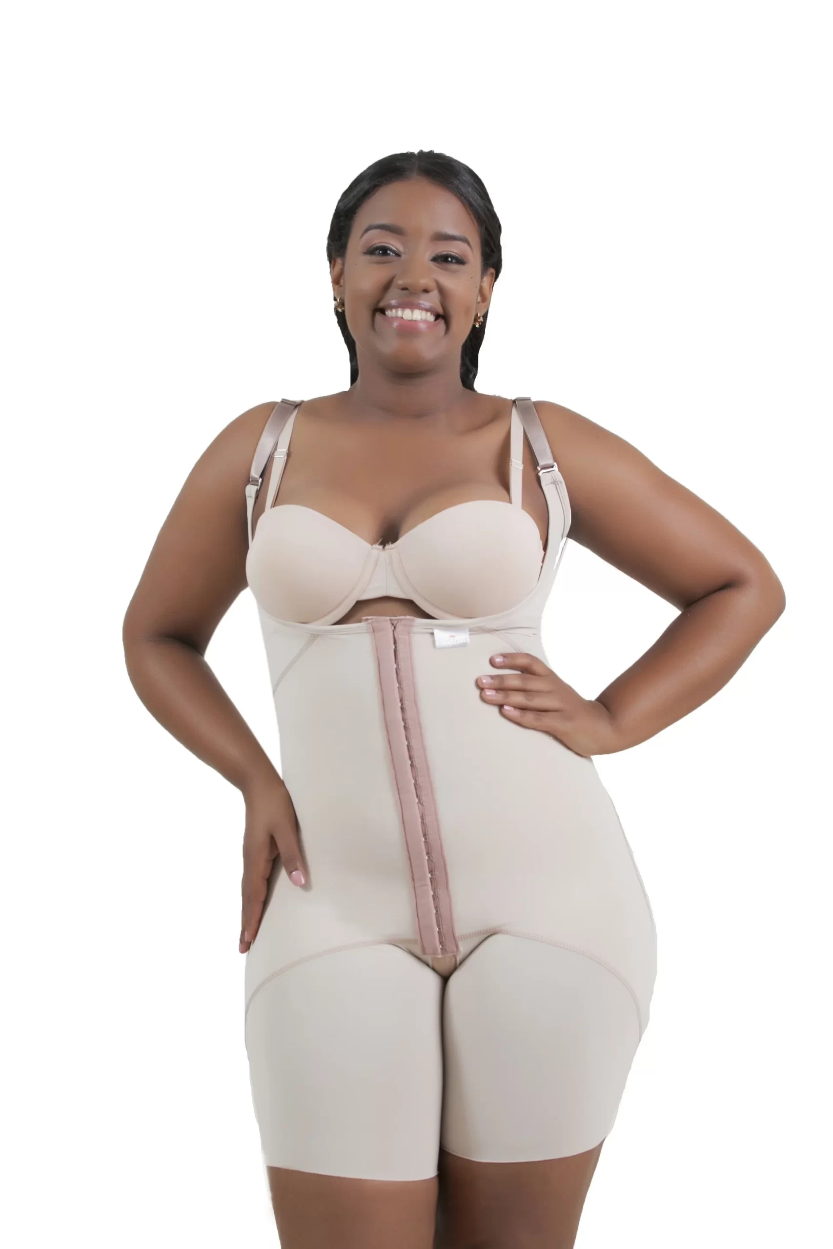 Faja Post-quirúrgica con busto al vacÃo, la espalda cubierta; tirantes removibles, refuerzo abdominales y abrochadura en el frente con tres hileras de ajuste.